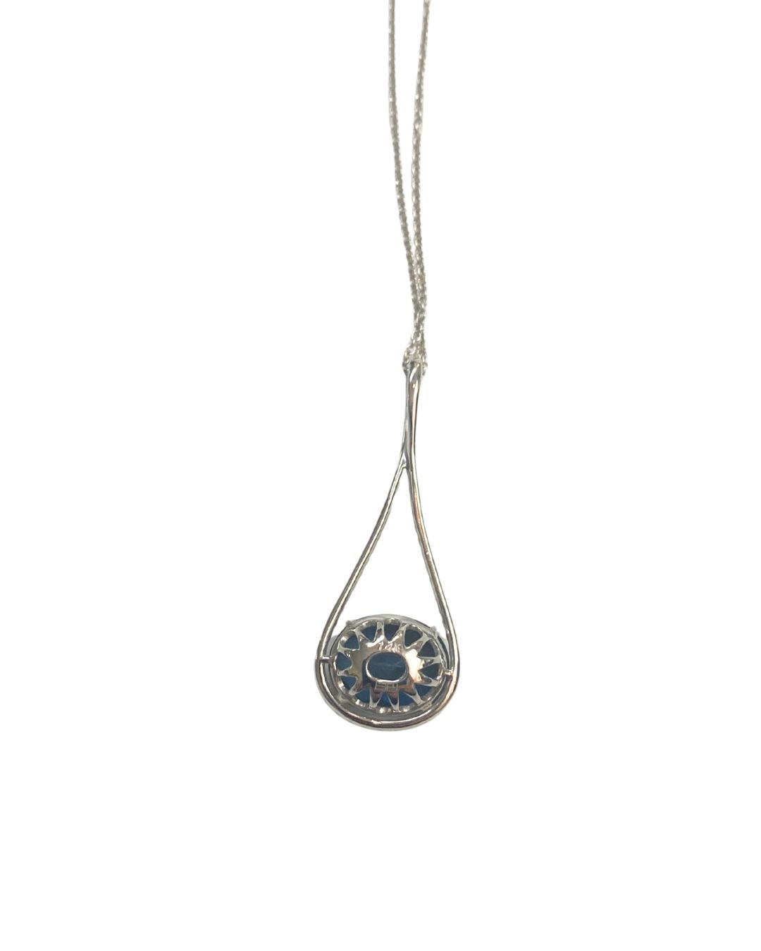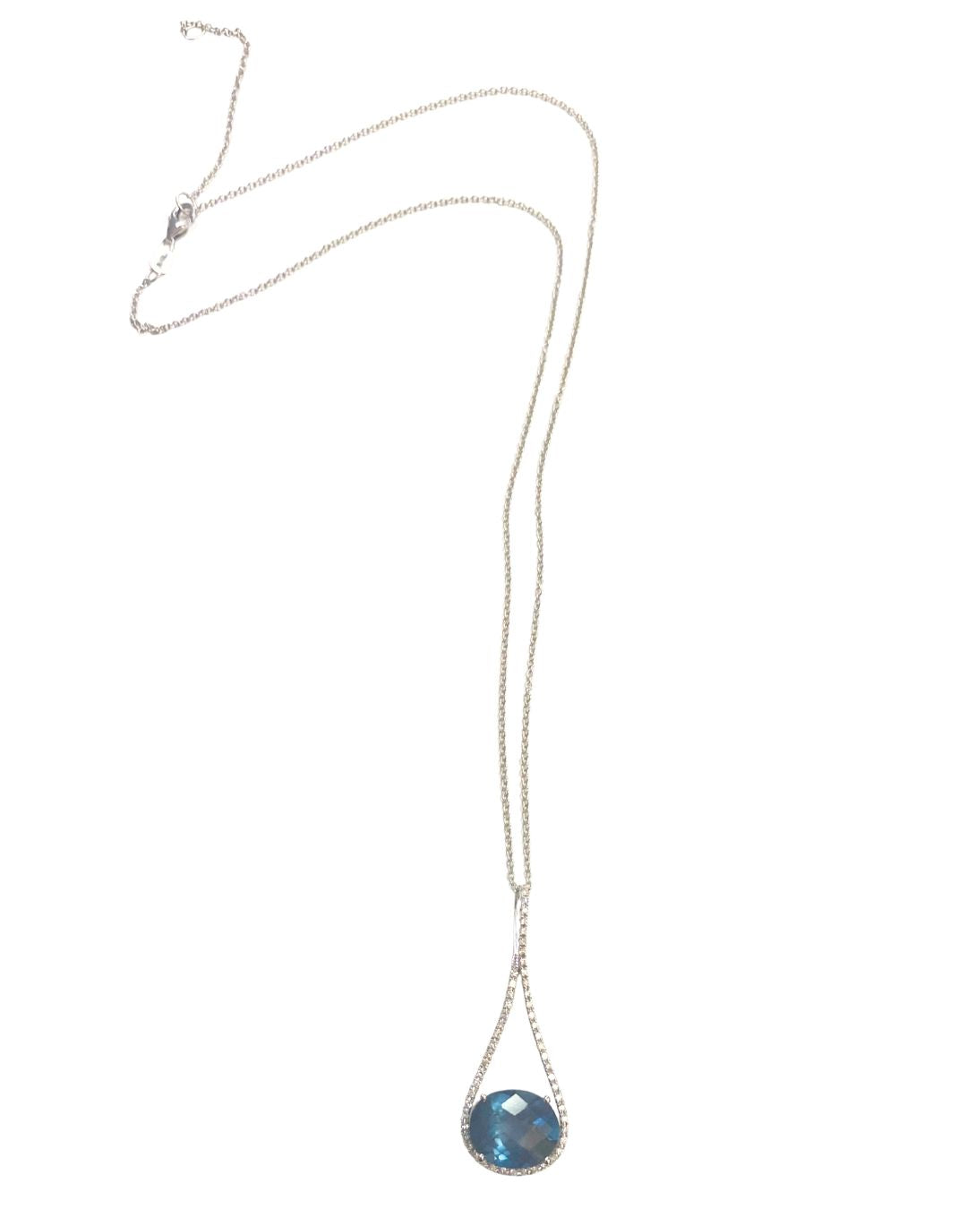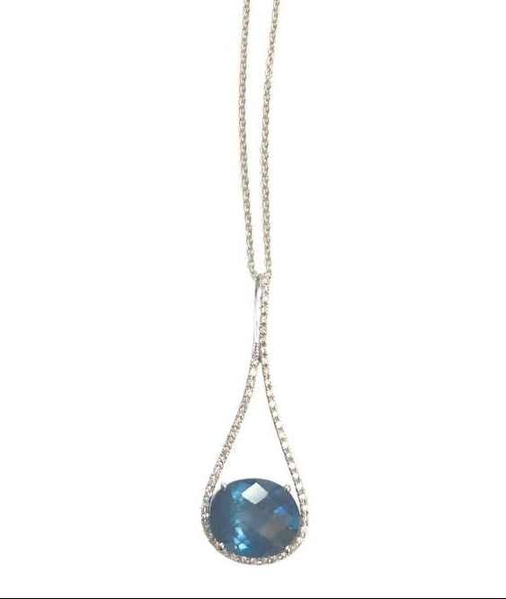 This refined drop necklace features a faceted deep blue topaz framed in a delicate halo of diamonds, suspended within a graceful teardrop silhouette of solid 14k gold. The elongated setting creates beautiful movement and light, catching the eye without ever feeling overdone.