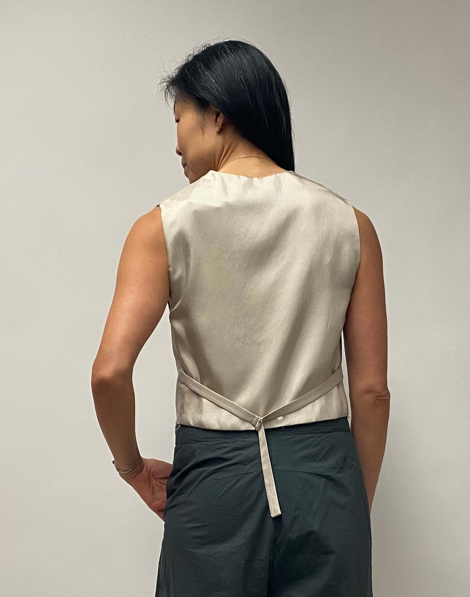 The soft neutral tone and minimalist lines make it endlessly versatile—layer over a crisp poplin shirt, a lightweight knit, or even a simple tee for that effortless European look. Thoughtful tailoring gives it definition without feeling fussy, and the quality of the fabric speaks for itself: substantial, refined, and made to be lived in.