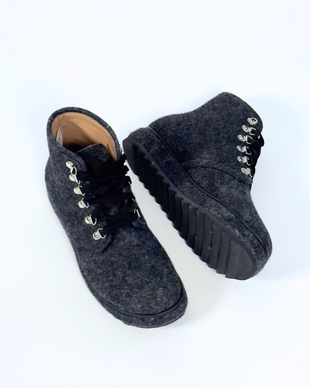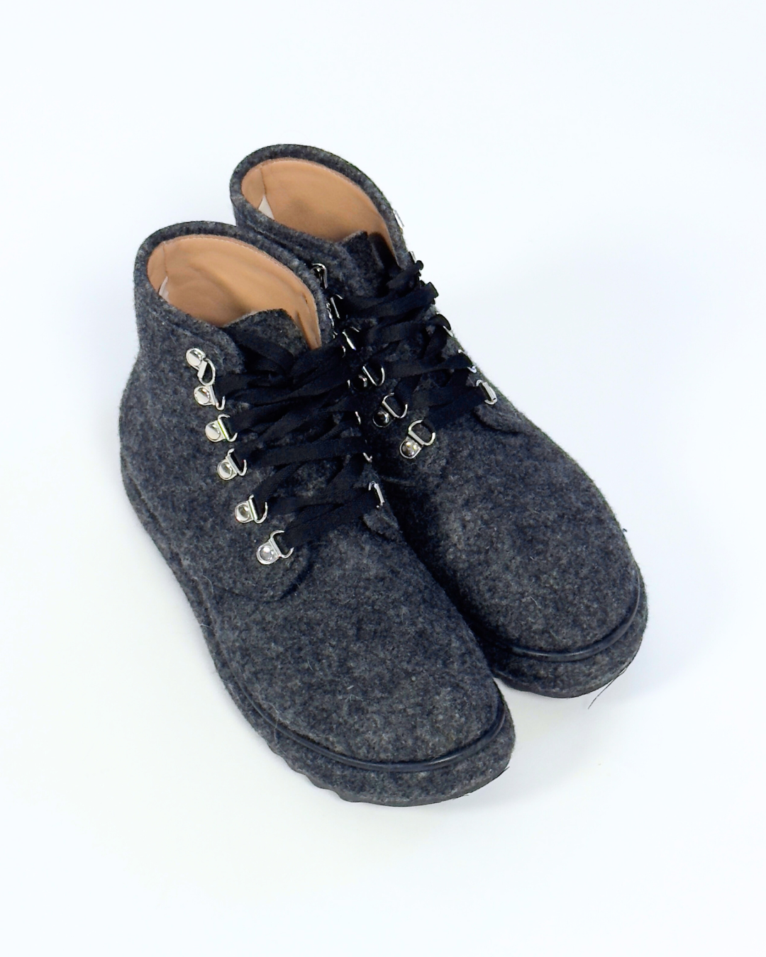 Lauren Manoogian hiker boot in dark grey brushed alpaca. Black laces with silver speedy hooks. Soft leather interior with ribbed outsole.